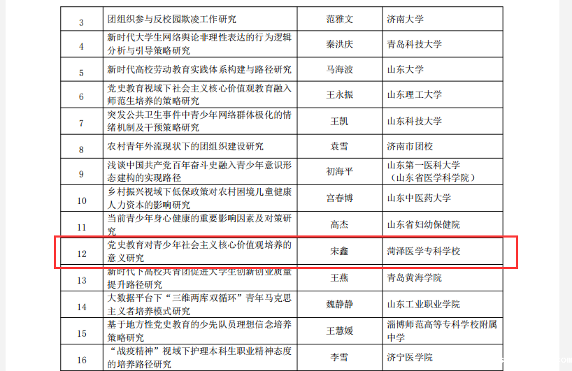 近日,山东省青少年研究规划管理办公室公布2021年度山东省青少年研究规划课题立项名单,我校思政部宋鑫老师申报的《党史教育对青少年社会主义核心价值观培养的意义研究》课题获得立项。
