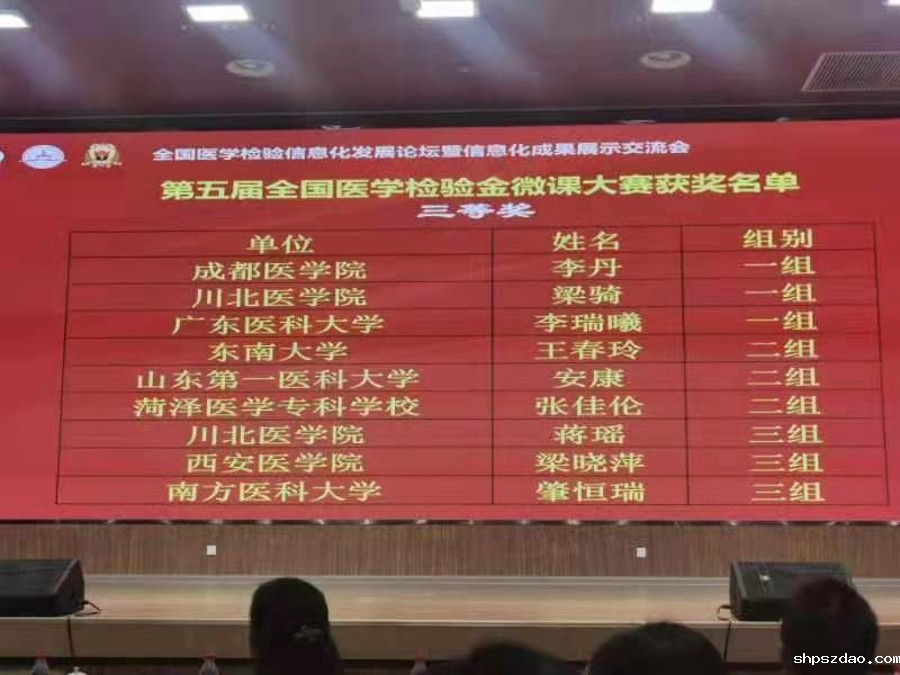 在第五届全国医学检验信息化教学能力大赛金微课组比赛中,张业霞老师、周阳老师、王学芳老师、付乐晨老师、张佳伦老师的《健康的法宝之抗体的功能》荣获二等奖;张佳伦老师、周阳老师、张业霞老师的《B细胞与Th细胞的相互作用》荣获三等奖;王学芳老师、张业霞老师、周阳老师、张佳伦老师的《有的放矢精准治疗的先决药物体外抗菌实验之K-B法》荣获三等奖;周阳老师、王学芳老师、张业霞老师、张佳伦老师、付乐晨老师的《都是鱼生惹的祸—肝吸虫》荣获三等奖。