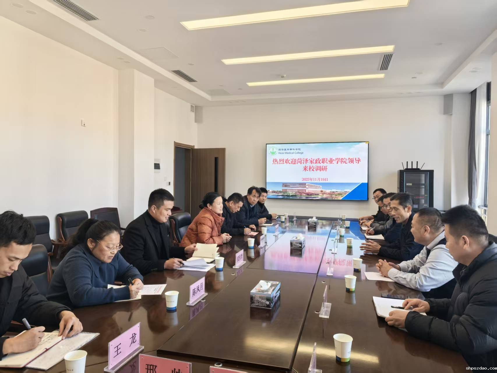 11月19日下午,菏泽家政职业学院党委委员、副院长帅志星一行7人来我校进行调研交流。我校党委委员、副校长代爱英、附属医院副院长苑斌、总务处相关工作人员陪同调研并出席座谈会。座谈会由总务处负责人武庆杰主持。