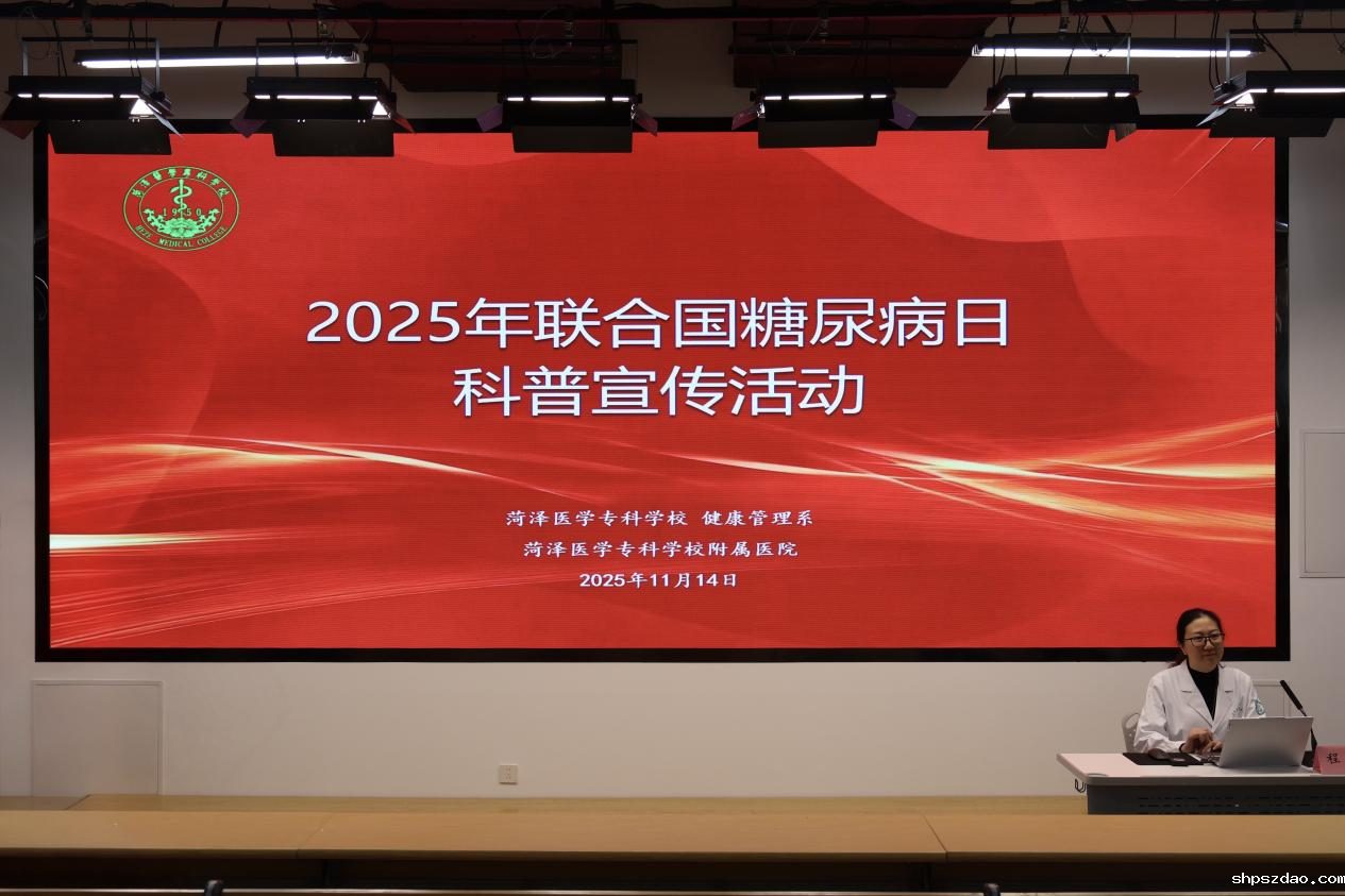 2025年11月14日是第19个联合国糖尿病日,为进一步提升学校师生对糖尿病的认知水平与防控能力,我校健康管理系联合菏泽医专附属医院内分泌科举办了以“糖尿病与幸福感”为主题的糖尿病科普宣传活动。健康管理系党总支书记李莹、副书记陈鲁曼,附属医院内分泌科副主任医师程培出席活动,师生代表300余人参与活动。