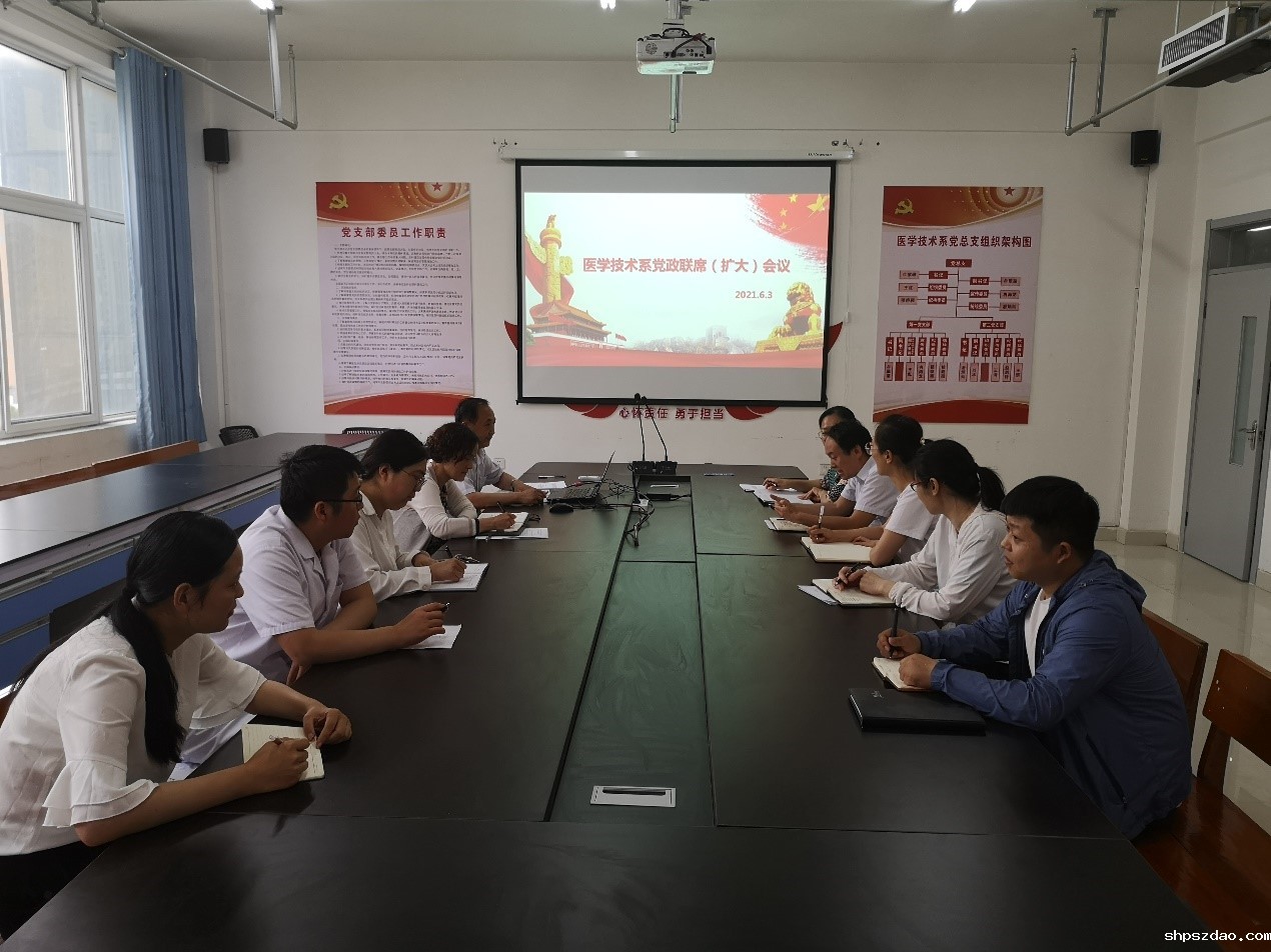 2021年6月3日下午,医学技术系在3号实验楼6楼党总支党员活动室召开医学技术系党政联席扩大会议。党总支书记牛家峰主持,党总支委员、系部主任、办公室正副主任、各教研室及实验室主任或主持工作的副主任参加会议。